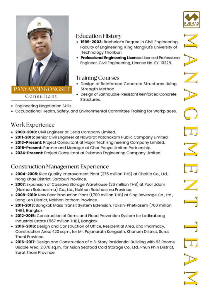 ทีมผู้บริหารของเราประกอบด้วยผู้เชี่ยวชาญตัวจริงจากหลากหลายสาขาวิศวกรรม ทั้งวิศวกรรมโยธา ระบบเครือข่าย เทคโนโลยีดิจิทัล และการบริหารความปลอดภัย โดยทุกคนมีประสบการณ์ทำงานในองค์กรชั้นนำของประเทศ ผ่านโครงการขนาดใหญ่ระดับร้อยล้านถึงพันล้านบาท ทั้งด้านงานก่อสร้าง โรงงาน ระบบโครงสร้างพื้นฐาน และโครงการเทคโนโลยีสมัยใหม่ พร้อมด้วยใบอนุญาตวิชาชีพและการอบรมเฉพาะทางจากสถาบันระดับประเทศและระดับนานาชาติ ทำให้เรามั่นใจว่าสามารถออกแบบ บริหาร และควบคุมงานได้อย่างมืออาชีพในทุกขั้นตอน เพื่อส่งมอบงานคุณภาพสูง ตรงเวลา และตอบโจทย์ทุกความต้องการของคุณอย่างเต็มศักยภาพ.